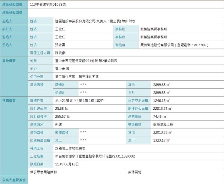 達麗台中「何安段」案,規劃興建地上21樓、地下4層,總戶數182戶,產品規劃21至38坪、二至三房的宜居建築,業界推估,每坪單價8字頭起跳,預計第四季正式公開。