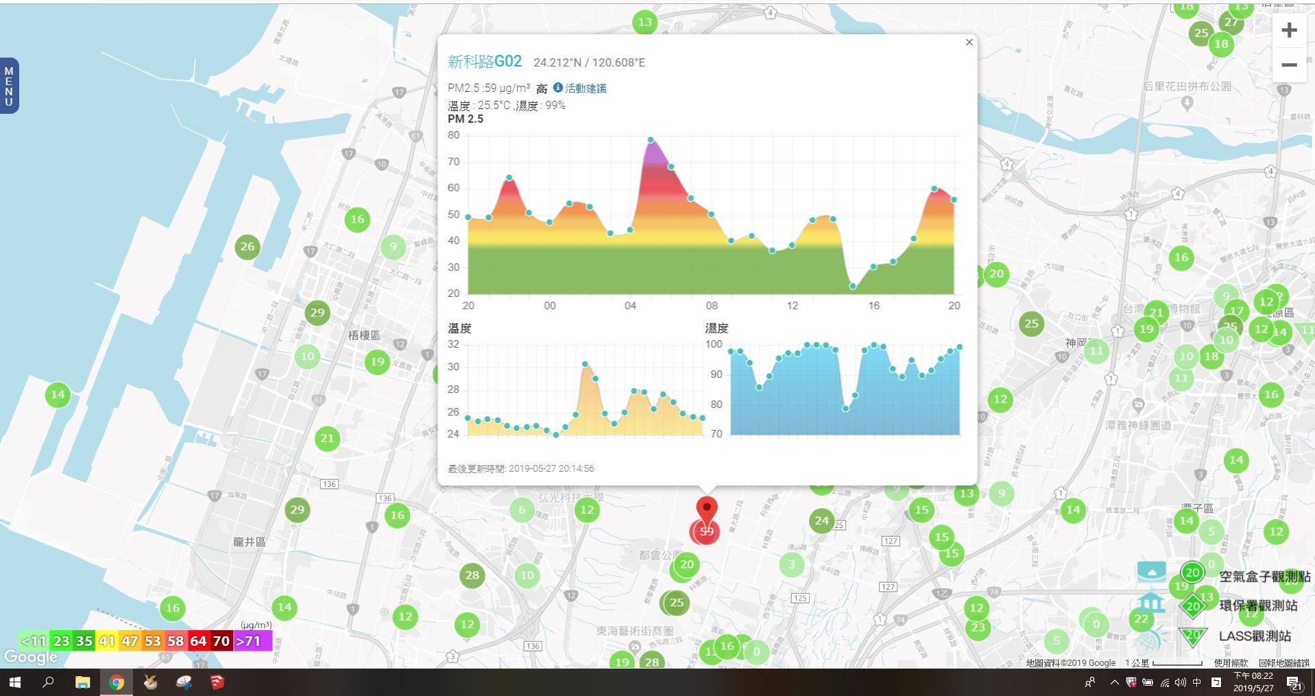 2019年05月25日 星期六 晚上 空氣盒子PM2.5 偵測台中市台中火車站樂業國小周邊2019年05月25日 星期六 晚上 空氣盒子PM2.5 偵測台中市府烏日焚化爐 周邊彰化縣 石牌坑2019年05月25日 星期六 晚上 空氣盒子PM2.5 偵測台北市2019年05月25日 星期六 晚上 空氣盒子PM2.5 偵測高雄市