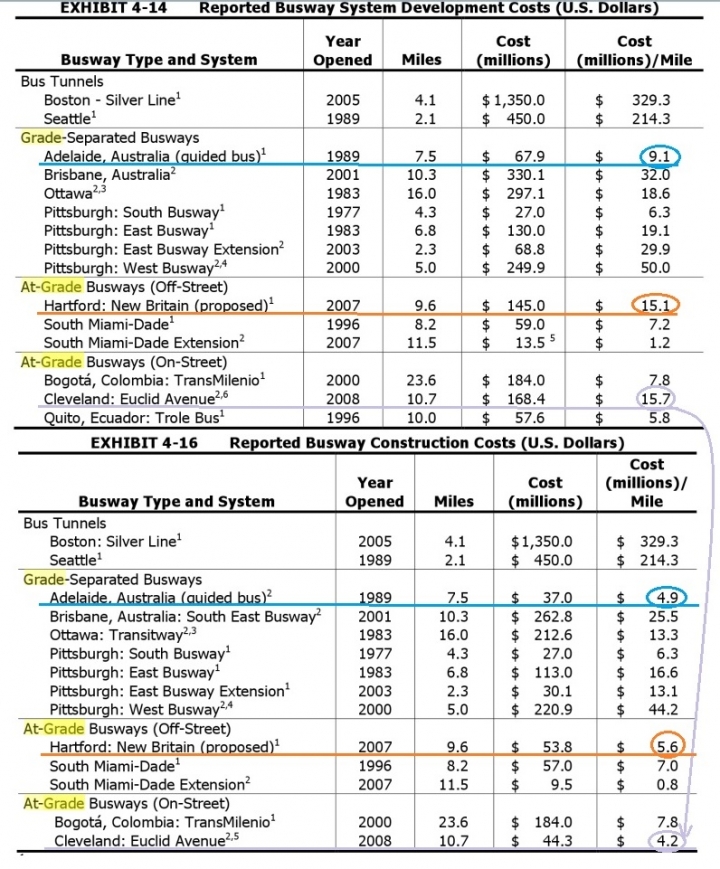 這種Grade-separated busways ,如澳州阿德雷德,這還是導軌巴士,道路全封閉式, 而且設有側邊導軌 ,比例為4.9/9.1 (百萬美金)