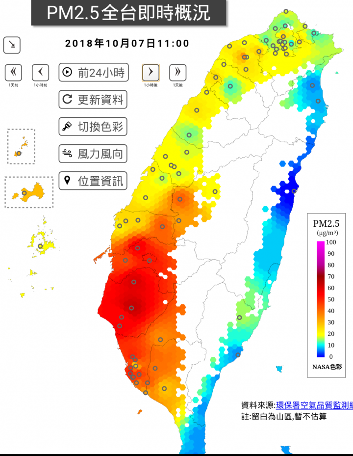 1.空氣盒子PM2.5觀測數據數值會說話 請按我https://airbox.edimaxcloud.com/空氣盒子 由台灣全國志工(做功德) 提供免費網路 免費PM2.5觀測大數據資料2.台灣中央氣象局 風場預報顯示圖 請按我https://www.cwb.gov.tw/cwbwifi/#2018/10/10/0600Z/wind/sfc/mercator=123.64,30.56,15002018年10月09日 週二 06:01 下午