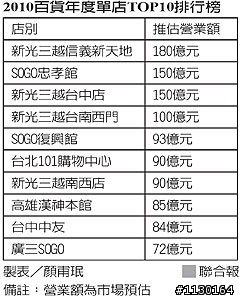 去年百貨年度營業額前十名台北包了5個台中包了3個高雄台南各1個