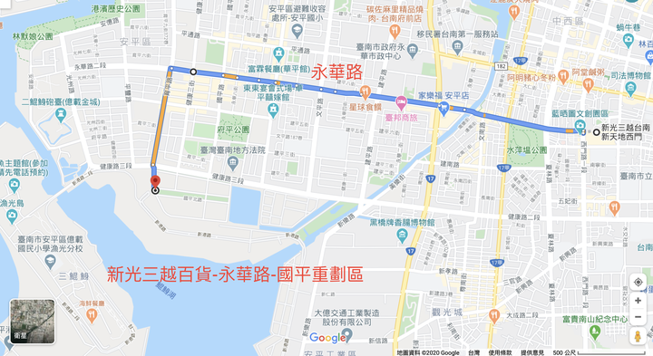 身為目前中西區居民以及未來國平重劃區的居民,近來開車往返這兩個地區十分頻繁,主要就是行駛永華路及健康路。這兩條道路是中西區和國平重劃區最近的路線,沿路除了景觀遼闊宜人外,也是寬敞又筆直的雙線道,號誌燈之間距離也長,如果是在非假日及非上下班交通尖峰時刻,開起車來十分舒適順暢,總是覺得一下子就到了目的地,因此鮮少注意到往來的時間。這次看到大家討論這兩個區域的交通,我也不禁好奇了起來,因此利用下班時間,來一趟實際的測試。(註:車上僅本駕駛一人,為了有圖有真相的01精神,紅燈停車時有拿手機拍照;因雨後及正值下班時間,車流量大;全程遵守交通規則,注意交通安全。)去程:從新光三越百貨西門店為起點,行經永華路,終點是聯上海棠和愛琴海兩個建案旁的道路里程:4公里(80350 km – 80354 km)時間:8分鐘(17:55 – 18:03)回程:以國平重劃區潤隆真愛建案旁近聯上海棠接待中心的路旁為起點,行經健康路,終點是原出發點新光三越百貨西門店里程:3公里(80355 km – 80358 km)時間:10分鐘(18:06 – 18:16)加碼:新光三越百貨西門店-漁光島海邊時間:18分鐘(18:16– 18:34)亞果遊艇集團中心,就在漁光島漁光大橋旁。自己戲稱今天的任務是”亞果出任務”的續集:”出任務到亞果”結論:雖然只是單一行程的往返實驗數據,不算客觀,但也驗證了google谷哥大神大數據下的資訊確實是準確有參考價值的。十月國慶煙火在台南安平漁光島,期待光輝燦爛的火花讓美麗的安平更亮眼動人