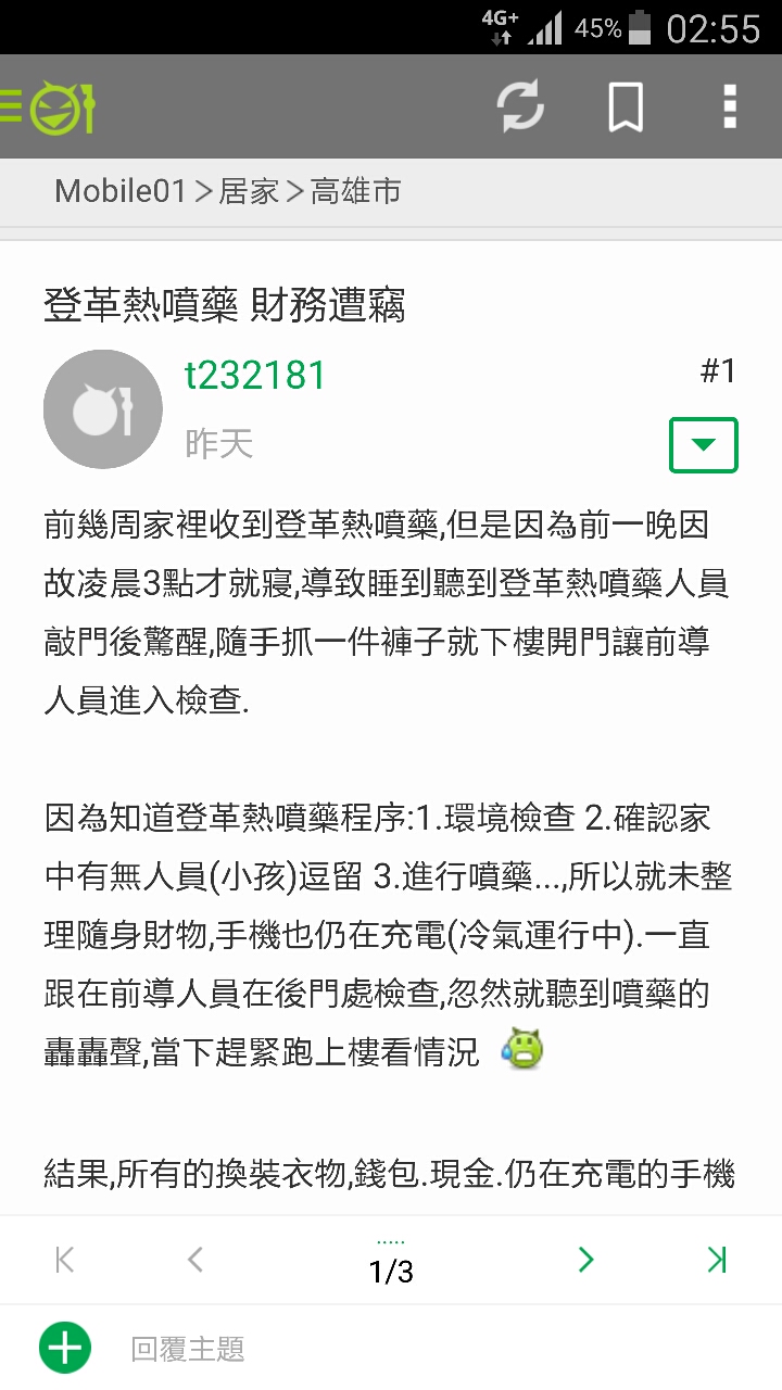 t232181 wrote:只能說,數週前已經提...(恕刪) 不好意思,我是看您內文提到數週前說要來噴藥所以到底是什麼時候才有通知噴藥呢?另外只是說如果您沒辦法舉證在噴藥人員進入前您的錢財有多少的話,那您事後再怎麼申訴也是沒有用的,甚至我認為也沒有媒體想替您報導,畢竟這是您單方面說詞而已,缺乏證據狀況下,警察當然沒辦法受理