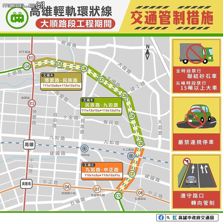 終於選完了! 輕軌大順路東段也即將復工!輕軌成圓要邁向最後一哩路囉! 只是大順路東段平常車多擁塞用路人真的要好好調適囉!大順路段(博愛路至中正路)的施工計畫,依據捷運局規劃為3段工區,各段工區範圍及進場架設施工圍籬之時間如下:1、工區A:大順一路「博愛路至民族路」:111年12月6日起。2、工區B:大順二路「民族路至九如路」:111年12月12日起。3、工區C:大順三路「九如路至中正路」:112年1月3日起。高雄輕軌二階工程6日進場施工 多項交通管制看這裡