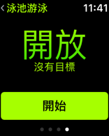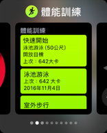 現在來與各位前輩分享一下今天的試用心得:下水前先選擇"體能訓練":或是Dock裡面的分頁,播到下方有一個"泳池游泳"的選項,點選進入:(註:有使用過的會優先放在上方,並主動定為預設選項,不用每次下水前重新設定一次。)我只有設定泳池規格為50米,其他卡路里等目標沒有再設定,就直接按下"開始":游完之後,按壓Digital Crown會出現這畫面,向下轉動時,即可解鎖畫面,並同時排水:向左撥,還有個畫面可以暫停計時(右下雙黃線)、繼續計時(右下黃圈)、再次鎖定(上方水滴)與最重要的"結束"(左下紅色的X)這個"結束"很重要,按壓後,它會即時提供一份戰況說明,可惜還沒拍到畫面就把它關掉了;但是這資料就已經傳回手機上了,如圖:註:圈數是依照所設定泳池長度為一單位,並非來回一趟。所以以來回為一趟計算,為44/2=22趟,也剛好等於"距離"。電力消耗由下水前72%到上岸時的57%,僅耗掉15%,太優了!另,游泳時,抬手想看圈數,有時有顯示,有時沒有,應該是抬手的姿勢沒能辨識,我再研究看看吧。