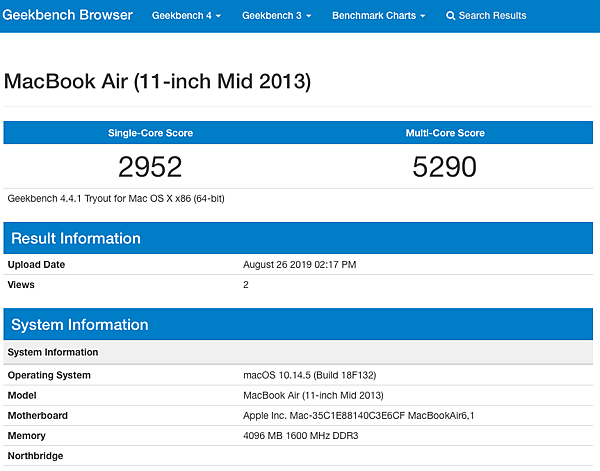 MacBook Air (11-inch Mid 2013) 單核2952分,多核5290分