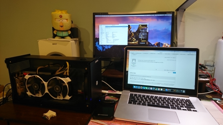 法客 wrote:我也想看看精鋼合體後...) 我自己等不及已經衝一組讓他們合體了 GTX 970 Windows 10 macOS 10.12.2都可以成功運作一開始開機 在偵測GPU的過程不太穩定,但是偵測到之後開始工作就滿聽話的 目前沒有工作中出問題的狀況