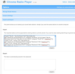 點一下上述連結,會看到許多程式碼,請全部選取,然後回到Chrome Radio Player的 options選項,點選Import and Export。把剛剛看到的程式碼貼進去。