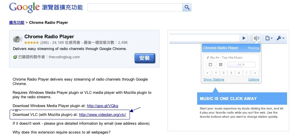 無意中看到看到Google瀏覽器有Chrome Radio player 這個擴充功能。