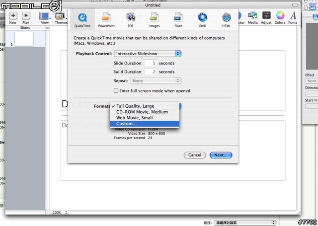 輸出的時候,請選擇「Custom...」自訂影像為H.263 我的Keynote2輸出看到的是編碼H.264。因為WIN版的QT沒有到7.0所以不支援H.264(有QT7試用版,但是用了會不能看H.263)以下附圖