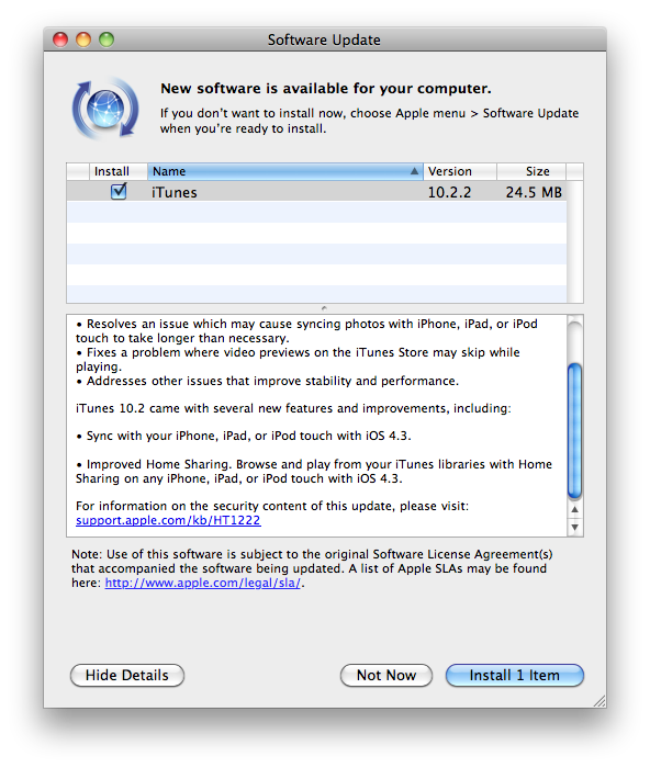 *Addresses an issue where iTunes may become unresponsive when syncing an iPad. *Resolves an issue which may cause syncing photos with iPhone, iPad, or iPod touch to take longer than necessary. *Fixes a problem where video previews on the iTunes Store may skip while playing. *Addresses other issues that improve stability and performance.