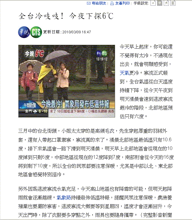 低溫特報今天下午下了一下雨後, 天氣明顯溜滑梯式下降, 各位要去夜騎, 可要記得保暖衣物要準備好哦...今天yahoo新聞http://tw.news.yahoo.com/article/url/d/a/100309/69/21qg9.html