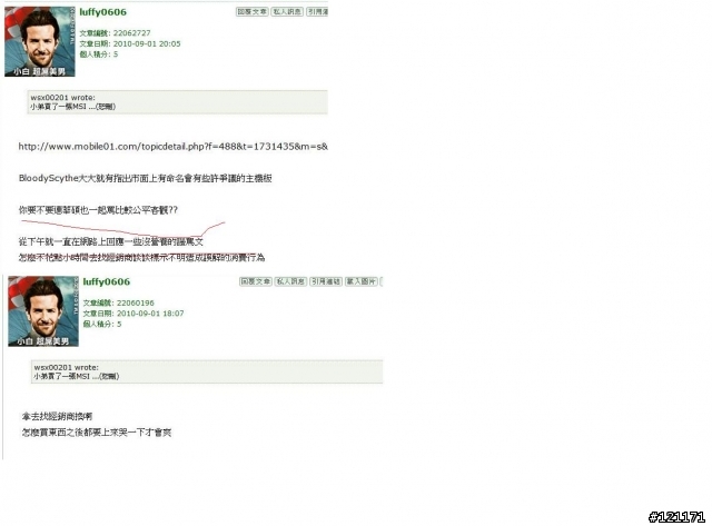 luffy0606 wrote:標錯的確錯就是錯,這...(恕刪) 唉唉,連華碩都拖下水,雖然本人用過華碩的東西也有過非常不愉快的經驗。又罵我是雞排的工讀生,最後再把責任推給微星~~~來喔,來看看什麼叫建設性的發言,對了,我證據已經幫你蒐集好了,勸你最好備齊文件來告我說不定這樣網路警察還會相信你。還有插花,誰跟你討論阿,我上面已經回了,我看到你的發言連鳥都不想鳥。