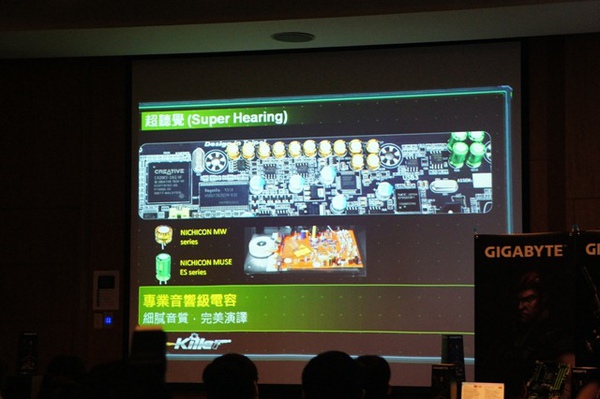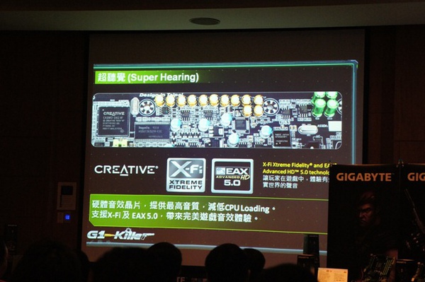 超聽覺部分,G1-Killer遊戲專用主機板使用Creative的Soundblaster X-Fi音效處理晶片,搭配X-Fi Xtreme Fidelity及EAX Advanced HD 5.0技術,讓User可以享受身歷其境的聲音效果。