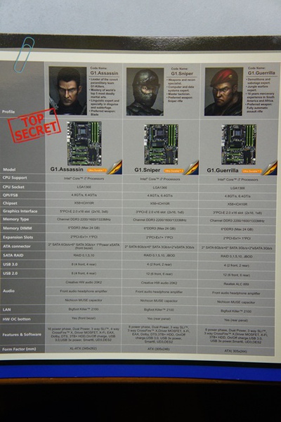 目前G1-Killer遊戲專用主機板會有三種型號,分別以刺殺者(Assassin)、狙擊手(Sniper)、游擊隊(Guerrilla)來分別代表。而三個型號的G1-Killer遊戲專用主機板規格說明,可以參考下面的照片。