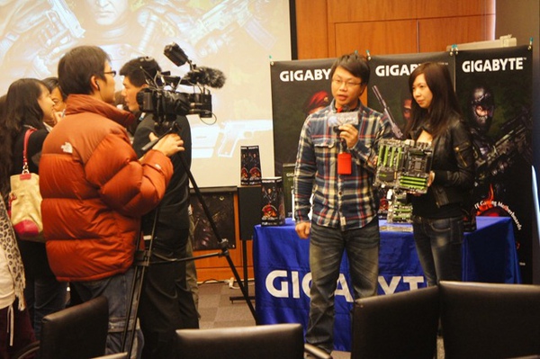 另一邊,負責此專案的技嘉工作人員,也被媒體包圍,詢問G1-Killer遊戲專用主機板的相關問題。