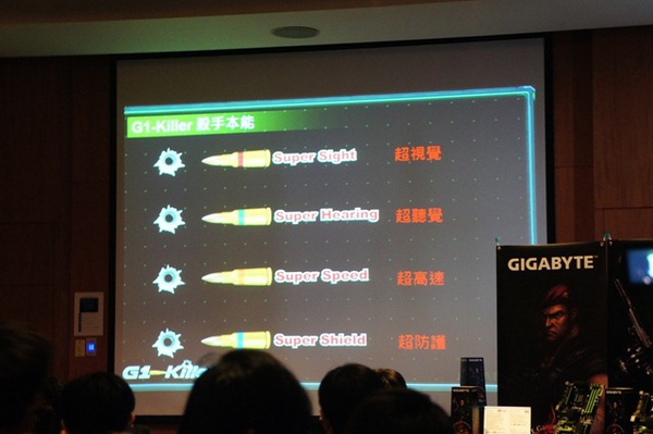 這是簡報後面的投影片,在這裡先列出來,讓各位大大知道G1-Killer遊戲專用主機板所要強調的四大重點,也就是超視覺、超聽覺、超高速、超防護。