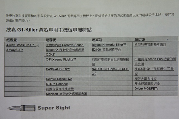 當然G1-Killer遊戲專用主機板的特色,不會只有投影片內容的那些而已。其它的部分,在賴經理進行簡報時,由口述的方式進行說明。以下,就是從簡報資料中擷取的特色資料表格照片。