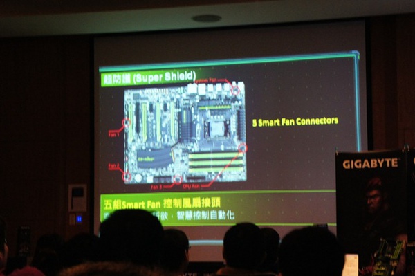 首先是超防護。而投影片中介紹到,G1-Killer遊戲專用主機板具有5組Smart Fan控制功能的風扇接頭,藉由技嘉開發的程式,或是主機的BIOS進行調整,讓系統及CPU能達到最佳的散熱狀況。