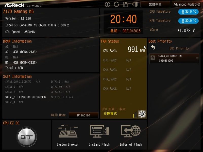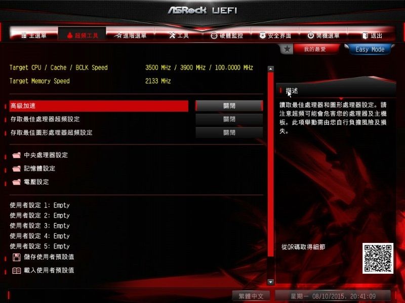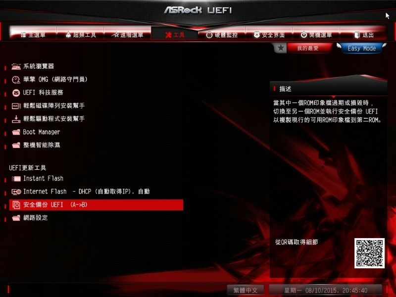 這次 ASRock 在 BIOS 上做了一個比較大的介面調整,針對一般使用者追加了所謂的 EZ Mode,以一個比較簡單的圖形化界面來顯示資訊,並提供開機裝置切換、風扇轉速調整、BIOS 更新以及快速超頻等等,比較可惜的是在目前 BIOS 版本還沒有完全的中文化。