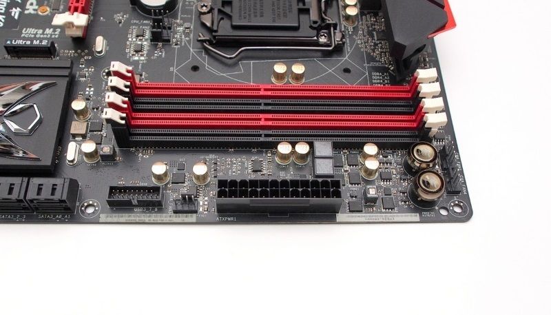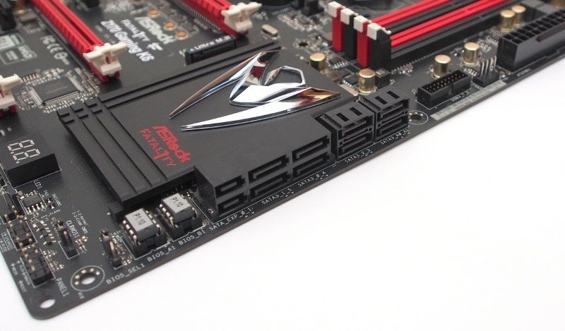 記憶體部分採用 DDR4,可以看到 DIMM 同樣選用了單邊扣方便拆裝,值得一提的是 ASRock 這次又把 Power 跟 Reset 按鍵加回來 (感動),雖然在 Z97 一度消失不過終究還是回來了,但跟以往 Z87、Z77 比較不同的地方在於按鈕被換到上面來。