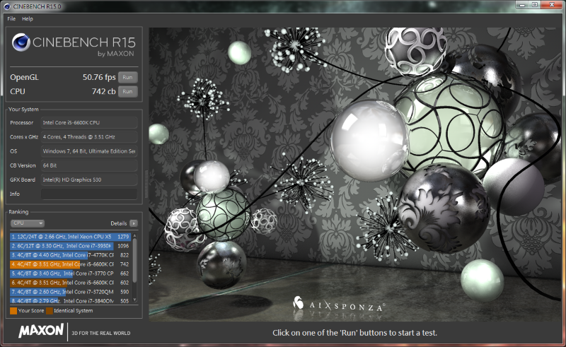 cinebench R15,OpenGL 50.76 fps、CPU 742 cb。