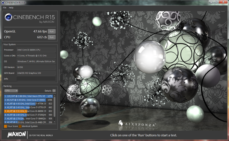 cinebench R15,OpenGL 47.66 fps、CPU 602 cb。