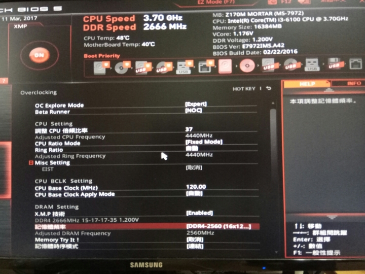 最近買了一塊MSI Z170M Mortar 的板子,想要將i3-6100超一下外頻,按照網路上的教學,下載了非K超頻的BIOS :A42版 更新了BIOS,改了外頻120跟電壓1.35v,打開超頻選項,關掉省電控制,結果頻率始終不為所動,所以想請教一下各位有什麼該注意的地方或是有同好知道問題在哪可以題點一下的感謝。