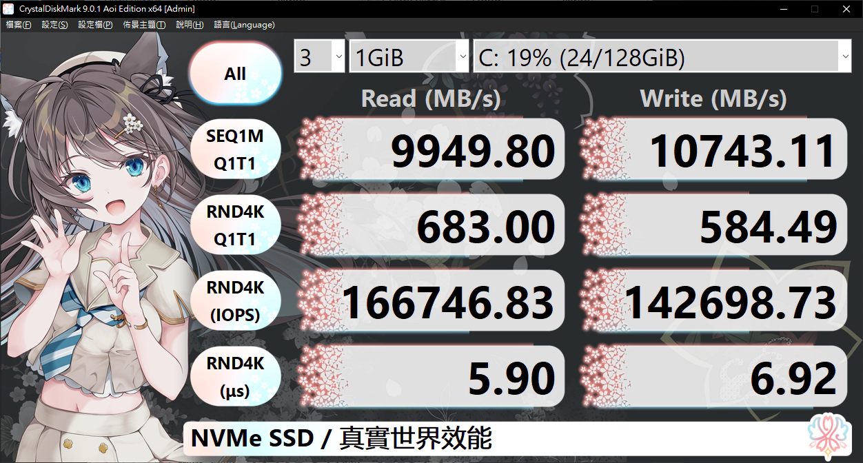 ▲使用 AIDA 64 進行 Linear Read 連續讀取測試,Block Size 為 8 MB,最快為 9163 MB/s,最低也有 7455 MB/s,全程速度基本都穩定維持在接近 9000 MB/s 左右,沒有明顯波動或掉速~