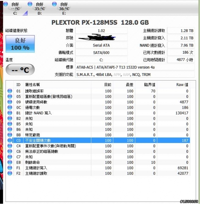 然後有時候在做系統調校時,調校好時會反覆開機測試且用計時器計時最短的開機時間,藉此來判斷調校的好壞。開機進桌面時,系統列常駐程式大約40個以上。不曉得是不是因為這樣導致讀寫次數及寫入容量增加,不過我倒是不太在意這些數據,每隔一段時間都有在做備份,掛了保內送修就好,是說這顆 SSD 購入至今也服役了 1年多,速度效能也頗令我滿意,沒意外應該還是會繼續支持 Plextor 吧,而且重點是它採用了 Marvell Controller 的主控,本人比較喜歡這種主控。是說不曉得 Plextor 的 下一代產品 M6S 什麼時候才會上市?