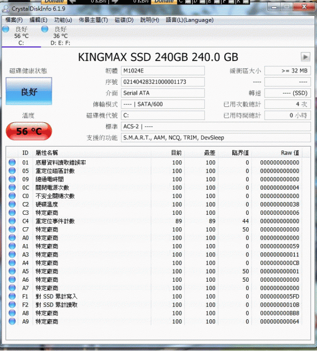 最新溫度回報....難道是筆電的關係嗎?可是傳統的硬碟較涼呢?...裝在同一台筆電內,只有36度新裝的....SSD KINGMAX SME35 Xvalue系列 240GB SATAⅢ固態硬碟貼一張熱情如火的ssd溫度表現....很熱情哦...用win7的系統映像回複後...馬上再重開約3次的重開機(改為amd的驅動)溫度就來到...56度了....一般使用約...48度左右只要使用量大的時候...>溫度就輕易上50度C了不知是否因是筆電的關係...散熱較不易想把SSD的外殼拆了...但有保固貼紙很粘...拆不下來..就算了看數據吧...真怕它會掛掉.........