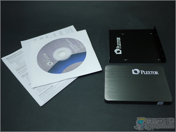 將裡面的產品掏出來排排站,除了Plextor M3以外,隨機附贈了2.5轉3.5的支架與非常好用的「Acronis True Image HD」: