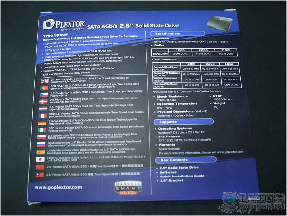 Plextor M3系列SSD除了一樣有Plextor獨家的「Ture Speed」與「即時還原技術」(Instant Restore)技術與SATAIII規格最高6GB/s的傳輸速度以外,更強調的是全系列提供了五年保固(非人為因素損壞),比其他競品提供三年保固來說多了一層保障,就算換筆電SSD也不需要換,畢竟SSD現階段來說還是屬於高單價的儲存裝置,保固一定是希望越長越好(不過現在拜泰國水災之賜,SSD與硬碟的價差已經接近了不少):