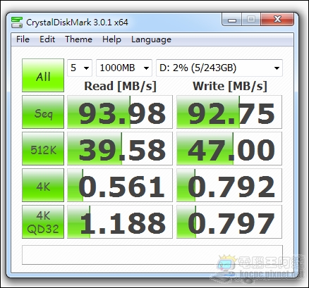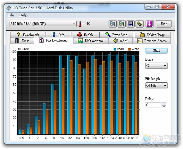 File Benchmark方面Seagate ST9500423AS最高來到讀取95MB/s;寫入在85~90MB/s: