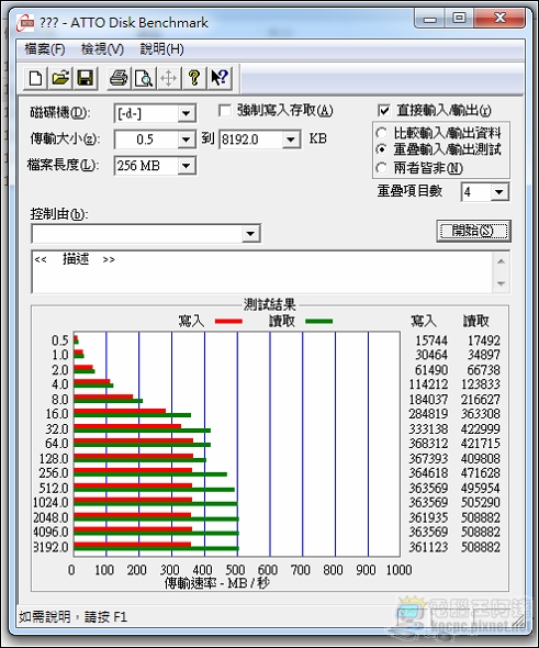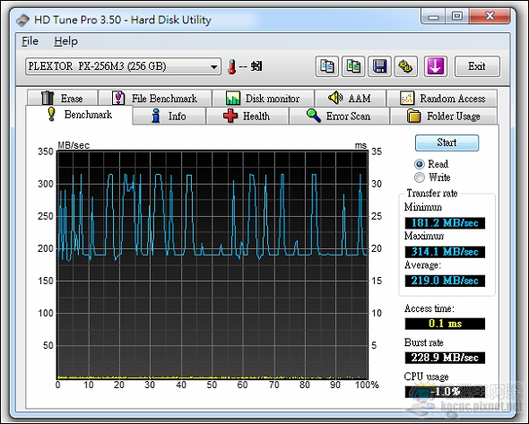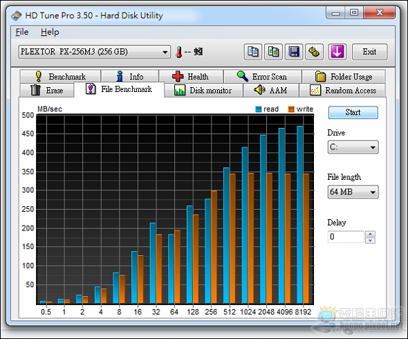 Plextor PX-256M3讀取最高到達500MB/s;寫入維持360MB/s左右: