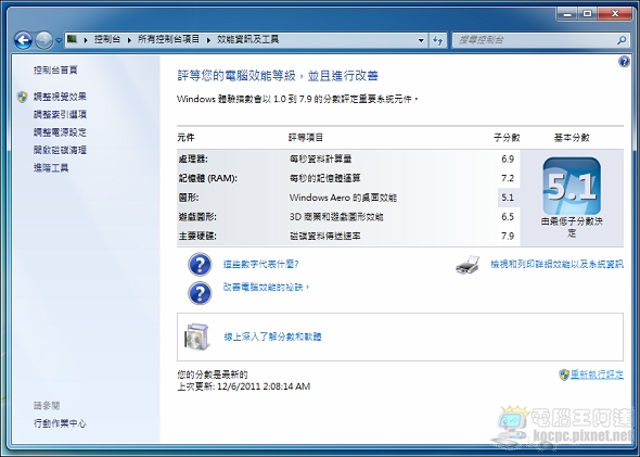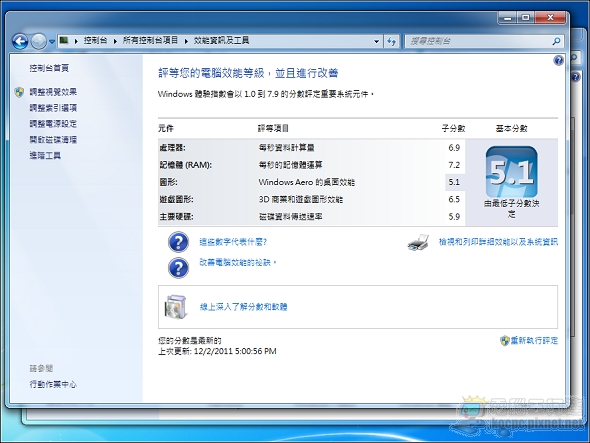 被圖形效能拖累基本分數只有5.1分,而Seagate ST9500423AS 7200轉HHD得到5.9分: