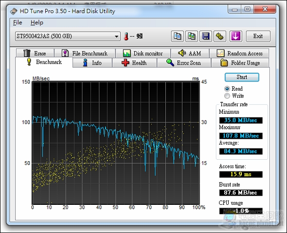 在Benchmark的部分Seagate ST9500423AS與一般硬碟差不多,很正常的分佈與成績:
