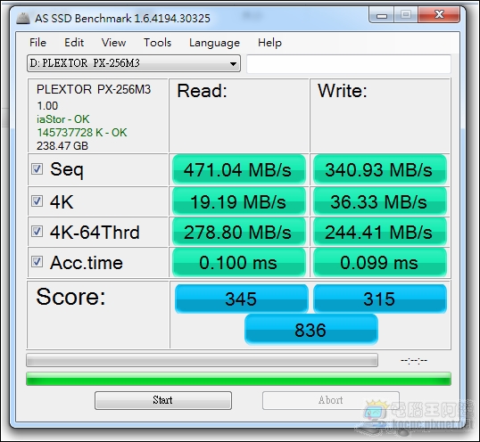 這部分只有Plextor PX-256M3測,這個項目對傳統硬碟來說我個人覺得有點傷,不作對照測試:
