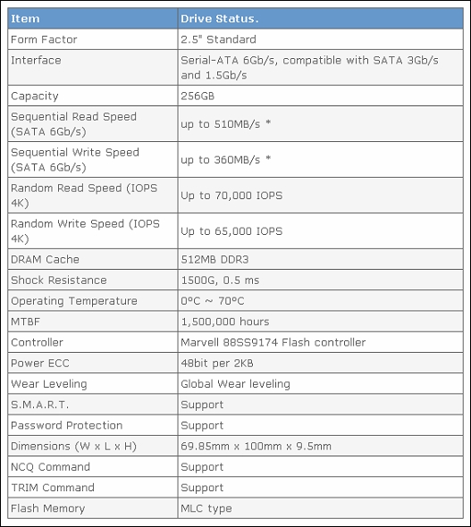 右上角有詳細的各容量M3 SSD規格,原則上越高等級的在Buffer與寫入速度上表現也越好,筆者測試的256GB版PX-256M3最高提供510 MB/s讀與360 MB/s寫入的速度:
