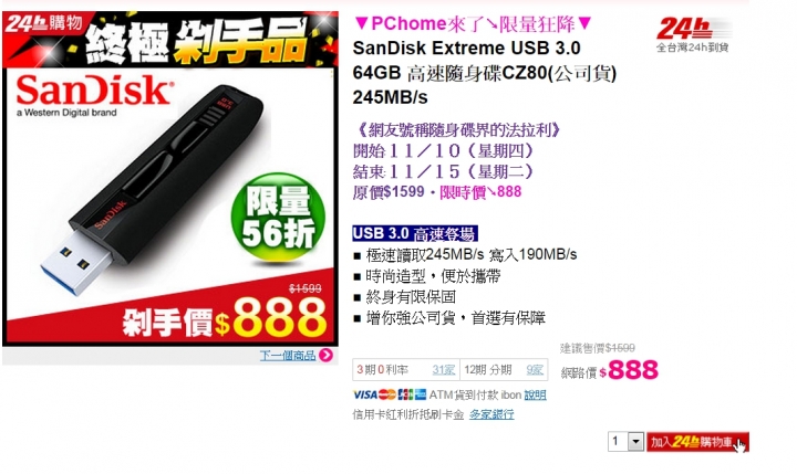 ▼PChome來了↘限量狂降▼SanDisk Extreme USB 3.0 64GB 高速隨身碟CZ80(公司貨) 245MB/s《網友號稱隨身碟界的法拉利》開始﹕11/10(星期四)結束﹕11/15(星期二)原價$1599.限時價↘888USB 3.0 高速豋場■ 極速讀取245MB/s 寫入190MB/s■ 時尚造型,便於攜帶■ 終身有限保固■ 增你強公司貨,首選有保障24小時到貨建議售價$1599