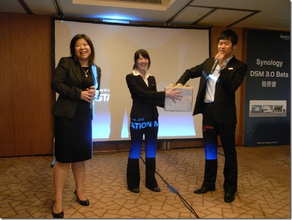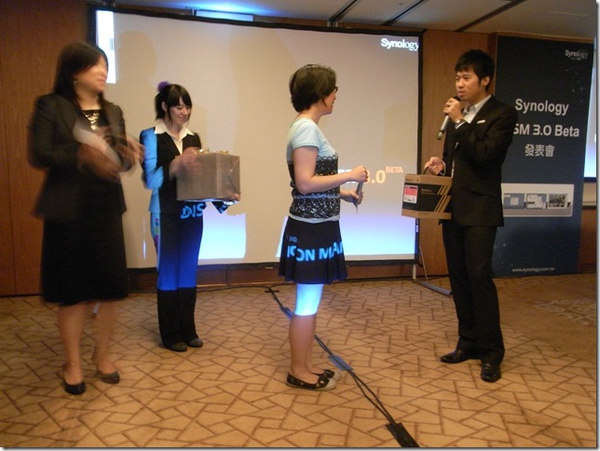 在精采的講說結束後,接著就是讓現場參加者很期待的抽獎活動了,由講師Chad進行抽獎(這張照片有把主持人Ann,也就是最左方的這位,給拍進來了)。而當天的抽獎獎品,則是兩台Disk Station 110J。