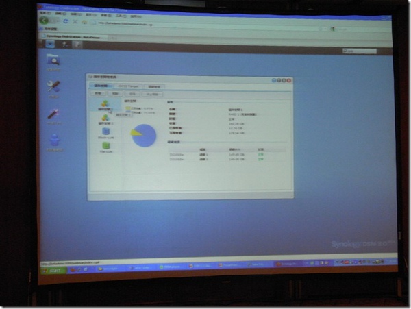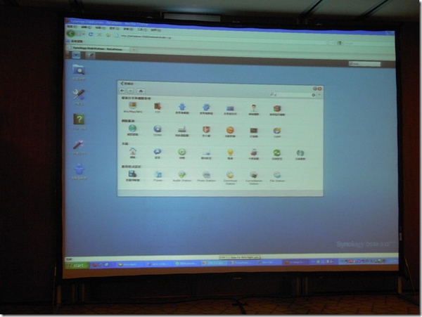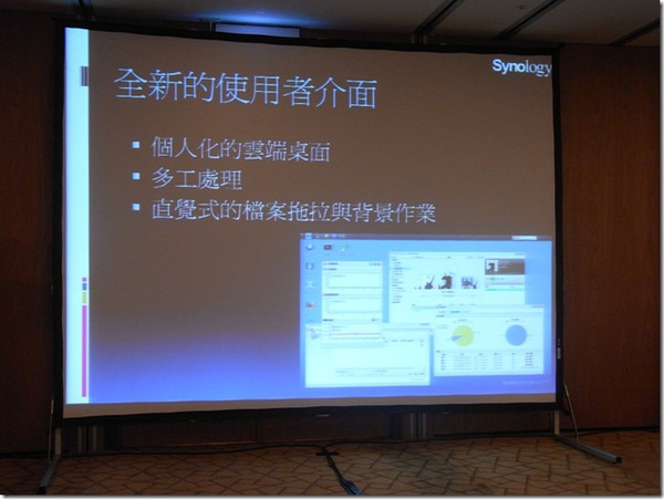 進入3.0版使用者介面的介紹。投影片中介紹的特點,統整來說,就是每個使用者用遠端連線的方式(IE、Firefox或其它瀏覽器登入),連到DiskStation自己專屬的桌面,用跟操作Windows相同的方式,在同一個桌面上來管理、使用DSM 3.0所有的功能。