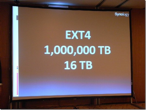 首先是支援了單檔16TB,總容量可達1000000TB的EXT4格式,讓企業用戶在使用上更加有彈性!不過講師Chad有說到,如果現有使用者想升級EXT4格式的話,目前唯一的方式就是: