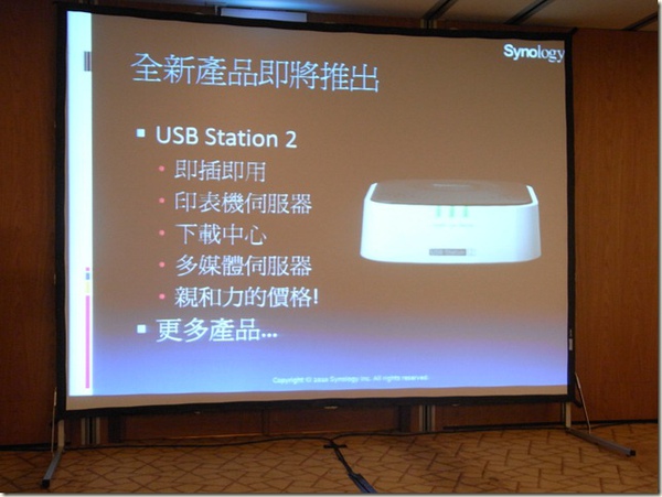 接著則是介紹即將推出的USB Station 2。從講師的說明、現場投影片內容,和我到Synology官網查詢前一代機種USB Station的功能後,USB Station 2最主要多了下載、多媒體伺服器兩個功能。至於售價的部份,講師賣關子,只說價錢會很「殺」!所以就等到產品上市後,看看講師有沒有騙我們囉!