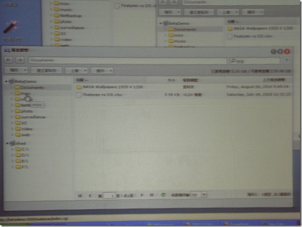 繼續進行檔案拖拉複製的示範。在3.0版中,只要開啟兩個檔案總管,就可以很方便地進行檔案搬移複製。而在複製的過程中,就算你登出DSM 3.0,複製動作還是會繼續進行的!