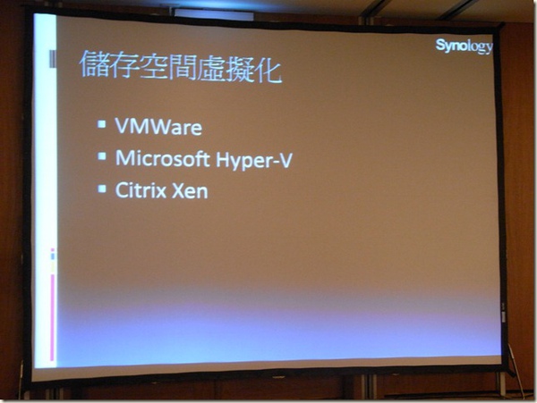 這張投影片,則是介紹Disk Station已得到VMWare的硬體認證,Microsoft Hyper-V及Citrix Xen的硬體認證,則是在申請中,就Chad的說明,應該是在DSM 3.0正式推出前就可取得這兩家的硬體認證。