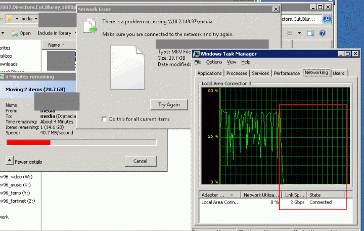 分享一個經驗,關掉 jumbo frame 再傳檔一次,對,沒有錯,即使 nic/nas/hub/router/ap 或任何中間的節點都有支援 jumbo packet 還是一樣,根據經驗,就是要關掉。