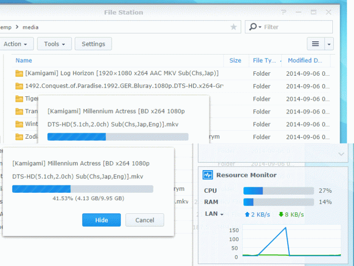 vxr wrote:NAS->Wi...(恕刪) 不幸的是...狀況依然如此...並且當傳到剩下5.82GB左右...整個DSM UI操作會變得很慢....非常慢, 像卡住一樣...但是當下的I/O只有幾百KB...=.=""...CPU loading也非常低..我在想想有 甚麼方式可以操作...