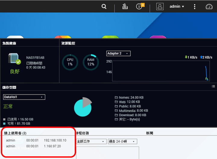 lwf555ug wrote:發現後就重新開機過好幾次,還是一樣。 lwf555ug wrote:紅框部份的線上使用者,會有30~50個再變動 如果樓主確實如 #6、#8 和 #10 樓所言已停用了 admin 帳號(您應該使用自己另建一個具有 administrator 權限的帳號登入),仍然還會有別人以 admin 登入,那建議樓主趕快找 QNAP 客服請求支援。