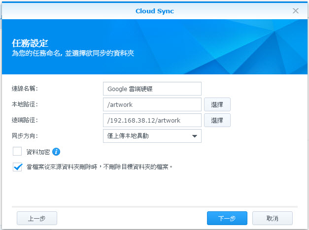 例如建立 Google Drive 同步, 希望將此台 NAS 中的 photo share folder 同步至 cloud /nas1/photo 目錄. 此時就必須先利用 browser 登入 Google Drive 手動建立 /nas1/photo 目錄, 再回到 Cloud Sync 繼續操作, 很不方便.